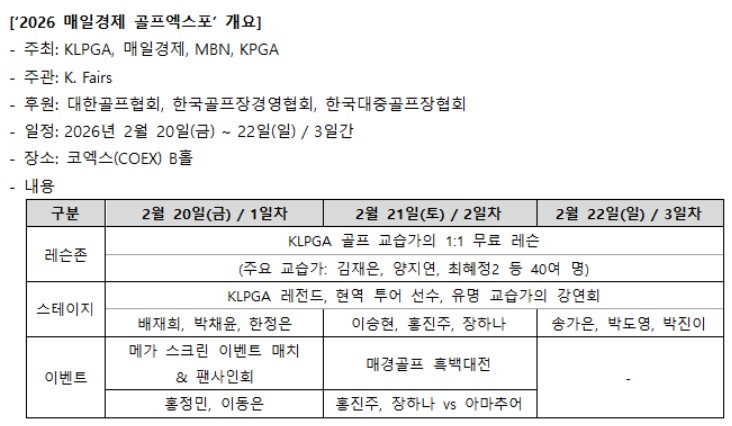 KLPGA는 "오는 2월 20일부터 22일까지 사흘간 서울 강남구 삼성동 코엑스(COEX) B홀에서 '2026 매일경제 골프엑스포'를 공동 주최한다"고 12일 밝혔다.