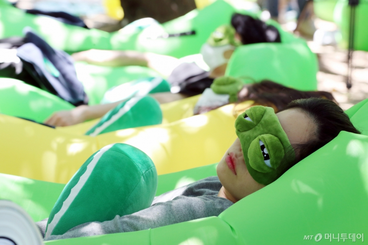 2019년 성동구 서울숲 내 가족마당에서 열린 유한킴벌리 '우푸푸(우리강산 푸르게 푸르게) 숲 속 꿀잠대회'에서 참가자들이 숙면을 취하고 있다. '우푸푸 숲 속 꿀잠대회'는 취업난, 스펙전쟁, 잦은 야근과 업무스트레스로 잠못이루는 현대인들에게 꿀잠을 선사하는 이색 대회로, 숲이 인간에게 주는 소중함을 알리는 행사다./사진=머니투데이 사진DB