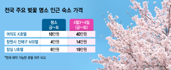 숙박업계 관계자는 "벚꽃 개화 시점과 주말이 맞물리면서 수요가 단기간에 집중되고 있다"며 "벚꽃 시즌은 기간이 짧은 만큼 특정 시기에 예약이 몰리는 특성이 있어 가격 변동 폭도 클 수밖에 없다"고 설명했다.