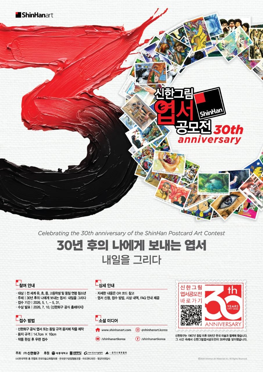 신한화구 관계자는 "신한그림엽서공모전은 1997년 시작 이후 30년 동안 40만명이 넘는 참가자들과 함께 성장해 온 공모전으로, 많은 역대 수상자들이 현재 미술계와 미술교육계에서 활동하고 있다"며 "해외 70여 개국의 참여가 이어지는 글로벌 공모전으로 자리 잡은 만큼, 30주년을 맞은 올해 참가자들이 자신만의 내일을 자유롭게 그려보는 뜻깊은 시간이 되길 바란다"고 했다.
