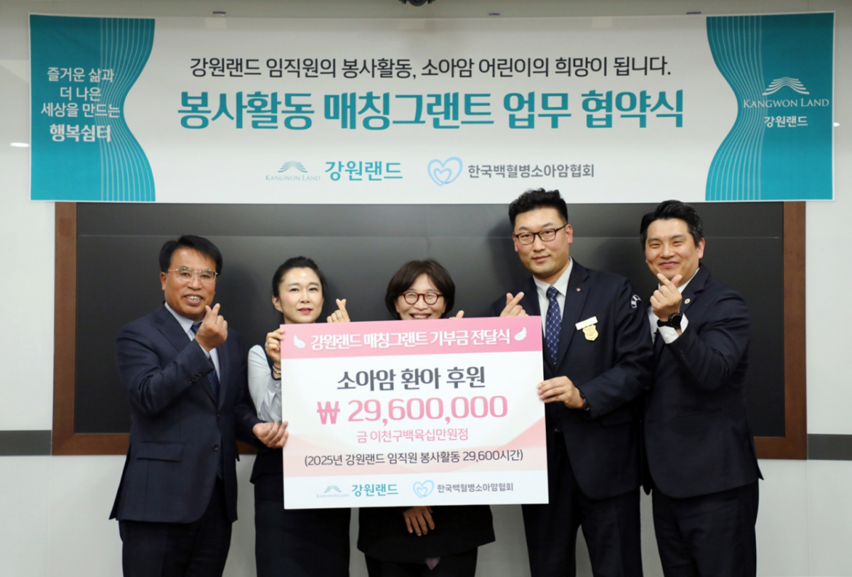 이번 기부금은 임직원들의 봉사활동 시간을 현금으로 환산해 기부하는 '봉사활동 매칭그랜트' 방식으로 마련됐다. 강원랜드는 지난해 임직원들이 참여한 총 2만9600시간의 봉사활동을 기준으로 2960만원의 기부금을 조성해 전달했다.