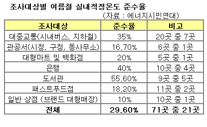 에너지관리공단이 권장하는 여름철 실내적정온도를 지킨 조사장소는 21곳, 29.6%에 그쳤다. 조사장소의 평균 온도는 24.7도로, 당시 평균 실외 온도와 5.7도 차이가 났다.