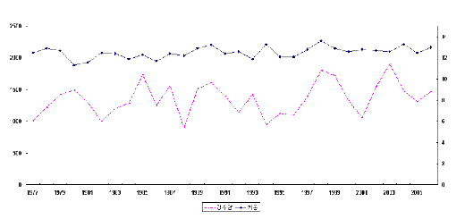 분석결과, 1997년부터 2006년까지 10년간 연 평균 강수량은 1500.7㎜인 것으로 나타났다. 이는 1977~1986년 10년간(1292.9㎜), 1987~1996년 10년간(1272.3㎜)보다 무려 207.8~228.4㎜이 많아진 수치다.