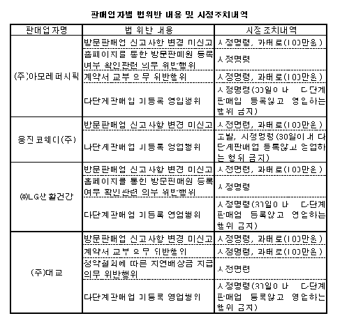 [표]불법다단계 행위 업체별 위반내용·시정조치