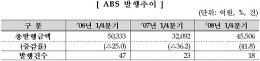 10일 금융감독원에 따르면 2008년 1분기 ABS 발행총액은 4조5506억원으로 전년 동기 대비 41.8% 증가했다. 이는 주택저당채권과 자동차금융채권을 기초자산으로 발행되는 주택저당증권(MBS), 오토론ABS의 발행이 크게 증가한 데 따른 것이다.