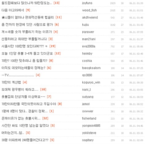 ☞"70만이라 한들 국민의 뜻이라고 우길 수야. 100만쯤 되면 국민 모두의 뜻인줄 아나본데... 우리나라 인구 5천만 아닌가? 서울 인구만 해도 1000만. 부화뇌동하는 10만 vs 절제하는 4990만." (jemol, 네이버)