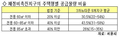 이 같은 비율은 시가 마련한 재정비촉진지구 주택형별 건립 기준 20%보다 10.5%포인트 높은 수준이다. 전체 8만6195가구 중 이들 지구에 공급되는 60㎡ 이하가 2만6279가구인 것을 감안하면 9040가구가 늘어나는 셈이다.