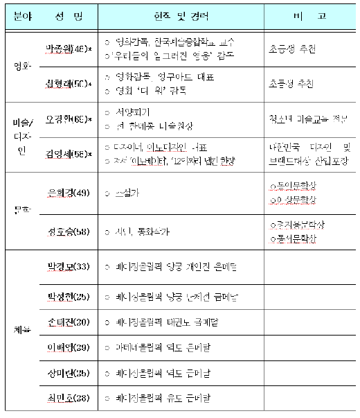 분야별로는 △음악에서 정명훈, 조수미씨외에 김대진 수원시향 지휘자와 백주영 서울대 음대 교수 △연극에서 송승환 PMC 대표와 뮤지컬 배우 남경주씨 △무용에서 발레리나 강수진씨와 문훈숙 유니버설발레단장 △만화에서 이원복 덕성여대 교수 △국악에서 김덕수 한국예술종합학교 전통예술원 교수와 강은일 해금플러스 대표 △영화에서 박종원 한국예술종합학교 교수와 심형래 영구아트 대표 △미술 디자인에서는 김영세 이노디자인 대표와 화가 오경환씨 △문학에서는 시인 정호승씨와 소설가 은희경씨 △체육에서는 장미란(역도) 최민호(유도)를 비롯해 박경모 박성현(이상 양궁) 손태진(태권도) 이배영(역도) 등의 인사들이 망라됐다.