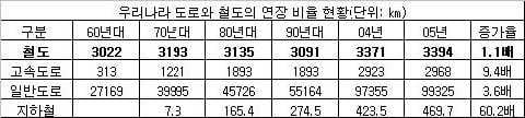 1960년대 말부터 40년 가까이 계속된 도로 위주의 투자 불균형정책은 도로와 철도의 연장에서도 두드러진다. 도로는 1971년에 약 4만4000㎞에서 2004년에는 약 10만㎞로 연장된 반면 철도는 1971년 약 3200㎞에서 거의 늘지 않은채 폐선과 신설을 거듭했다. 고속철도가 건설돼 운행되고 있는 2005년 기준으로도 철도는 약 3400㎞로 1971년에 비해 거의 연장되지 못했다.