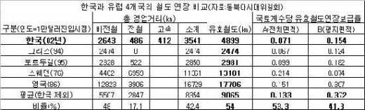 이런 현실은 향후 정부 예산에도 반영되고 있다. 2009년 정부예산(안)에는 철도 투자가 약 3조7000억원으로 도로 8조1400억원의 38.3% 수준에 불과하다. 반면 유럽은 도로에 비해 철도에 약 2.3배 더 많은 투자를 하고 있다.