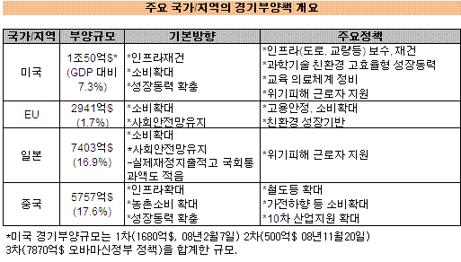미국의 경우 인프라 재건, 소비 진작, 성장동력 확충을 목적으로 경기부양책을 세우고 있다. 중국은 소비진작책을 추진하고 있으나 인프라의 재건보다 확충에 무게중심을 두고 있다. 미국이 교육, 의료체계 정비 등 인적자원의 강화를 통한 지속성장을 도모하려는 반면 중국은 산업구조 조정 및 산업육성정책이 강조되고 있다.