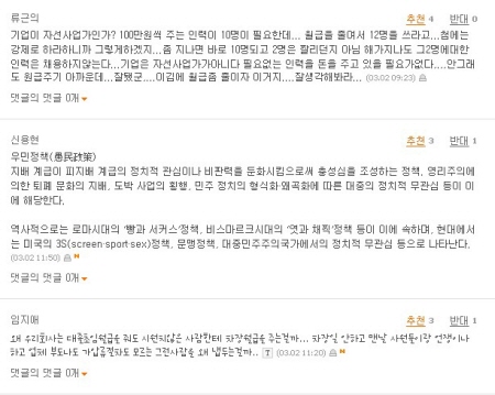 ☞ "하는 짓 없이 고액 연봉만 받는 윗대가리 한 명만 잘라도 대졸 초임 열 명은 새로 뽑을 수 있다."(김선환, 네이트)