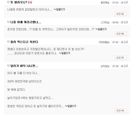☞ "환율 또 올라가겠네. 여기저기 우리나라 불안하다 광고하는 꼴 아냐?"(나은산, 네이트)