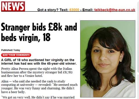 영국의 '더 선'은 "인터넷에 자신의 처녀성을 경매로 내놨던 앨리나 페르세아(18)가 경매에 응했던 45세의 이탈리아 남성과 성관계를 맺은 이야기를 공개했다"고 20일 보도했다.