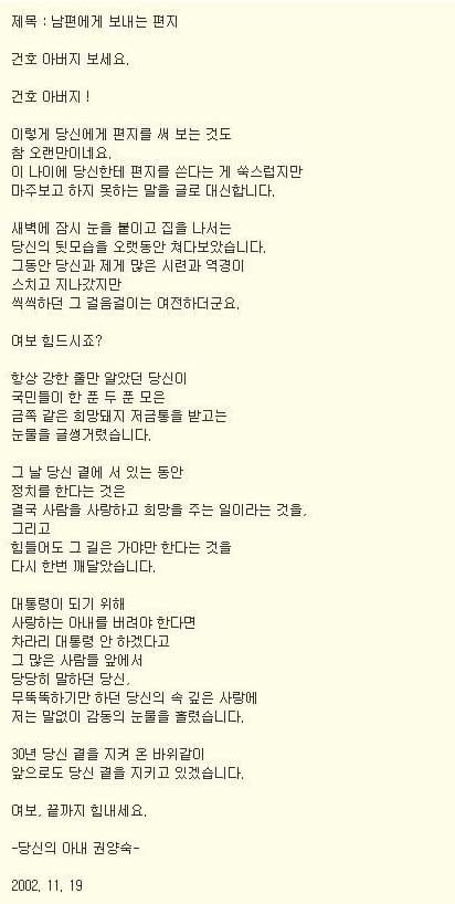 권 여사는 이 편지에서 "대통령이 되기 위해 사랑하는 아내를 버려야한다면 차라리 대통령 안하겠다고 당당히 말하던 당신, 무뚝뚝하기만 하던 당신의 속깊은 사랑에 저는 말없이 감동의 눈물을 흘렸다"며 애틋한 마음을 드러냈다.