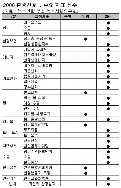 녹색연합 부설 녹색사회연구소는 지난 2007년 국내·외 통계자료를 분석해 한국 환경의 질 변화추이를 분석해 이를 일반인이 알기 쉽도록 신호등으로 표현한 '2008 환경신호등' 자료를 통해 4일 이같이 밝혔다.