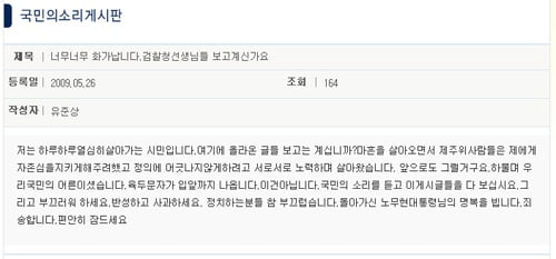 마지막으로 "돌아가신 노무현 대통령의 명복을 빕니다. 죄송합니다. 편안히 잠드세요"라고 애도했다.