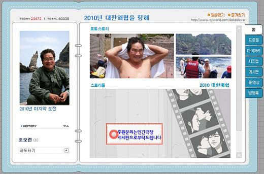 4일 숨진 조오련(57)씨가 미니홈피에 남긴 한 마디 다짐이 사람들의 마음을 더욱 안타깝게 하고 있다. 조씨는 2010년 예정돼 있던 대한해협 횡단에 대한 의지를 나타내며 ‘2010년 마지막 도전’이라는 다짐을 미니홈피 대문에 써 놓았다.