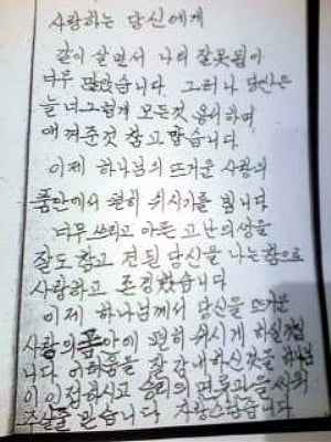 고 김대중 전 대통령의 부인 이희호 여사가 남편에게 보낸 마지막 친필편지가 입관식을 마친 20일 오후 3시쯤 공개됐다. 독자들의 PICK! "성소수자 지인과 불륜"…최동석, 박지윤 상간소송 각하에 항소 지석진, 은퇴 후 정계 진출?…"하필 옷 색깔이" 역술가 말에 '당황' 여제자 14번 간음, 숨지자 "내가 당해"…65세 파면 교수 죗값은 故정은우 "형동생 했던 것들에 뒤통수"...지인에 남긴 문자