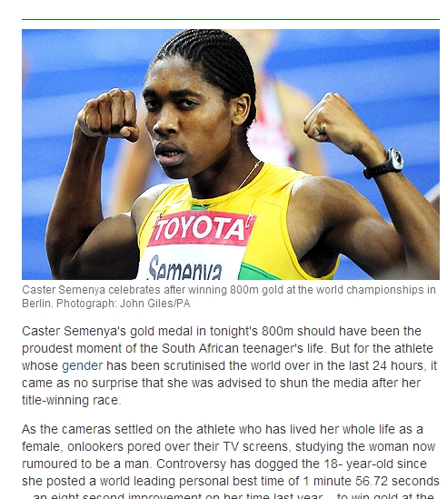 10일 영국의 가디언지 등 외신은 "세메냐의 성감별 검사 결과, 세메냐는 의학적으로 남성과 여성의 특성을 모두 가지고 있다"고 보도했다.
