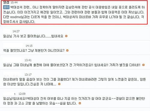 박씨의 고소와 관련해서 회원들의 글이 이어지자 카페의 운영자 '일심'은 "고소에 대한 대응은 내일 중으로 올리겠다"며 "이미 대응책을 짜놨다"고 밝혔다. 이어 "사건은 미네르바의 가짜 여부를 두고 진행될 것 같다"는 말도 덧붙였다.
