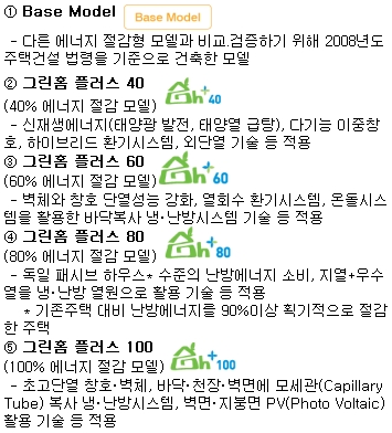 그린홈 플러스는 단지 특성과 경제성, 시공성 등을 고려해 에너지 절감 단계별로 기본모델(Base Model)과 에너지 절감률이 각각 40%, 60%, 80%, 100%인 4개의 모델을 제시했다.