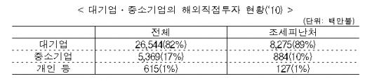 조세피난처에 대한 대기업의 직접투자 신고규모는 83억 달러로 조세피난처에 대한 전체 직접투자의 89%를 차지하고 있다. 우리나라 총 해외직접투자에서 대기업이 차지하는 비율이 82%인 것을 감안하면, 대기업의 해외직접투자가 조세피난처에 집중돼 있는 셈이다.