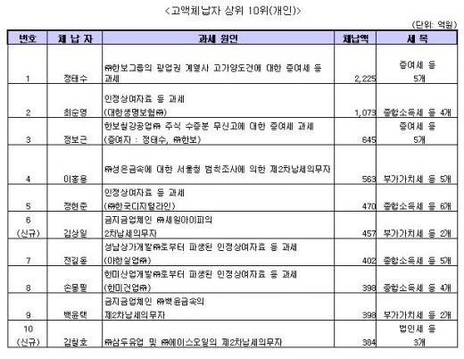 공평과세 위해 고액체납자 12명 추적조사, 거물급 퇴출 총수 대거포함