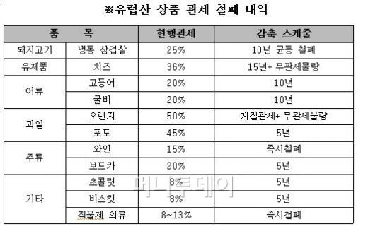 고등어, 굴비, 삼치 등 수산물의 관세율도 현재 20%에서 앞으로 10년간 매년 2%씩 감축, 소비자들의 장바구니 물가 부담을 덜어줄 것으로 기대된다. 아이들 간식으로 즐겨먹는 치즈(36%), 초콜릿(8%), 비스킷(8%)도 관세가 철폐되면서 훨씬 저렴한 가격에 구입할 수 있다. 치즈는 15년간, 초콜릿과 비스킷은 5년간 단계적으로 관세가 인하된다.