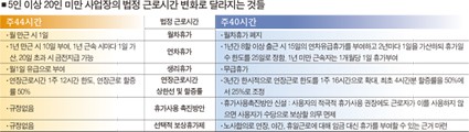 7월부터 5인 이상 20인 이하 사업장은 하루8시간 주40시간 근무를 지켜야 한다. 이외의 시간에 근무를 시킨다면 할증액 포함 연장근로에 대한 비용을 사용자가 부담해야 한다. 단 주5일 근무는 강제 조항이 아니다.