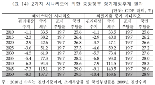 조세연구원은 현행 각종 제도를 그대로 유지한다는 전제 하에 노령화 등 인구변화만을 고려해도 2020년 국가채무는 GDP의 42.6%로 높아지고 2045년에는 115.1%에 도달할 것으로 추정했다. 삼성경제연구소도 국가채무가 2020년 52.8%, 2050년에는 113.3%에 달할 것으로 전망했다.