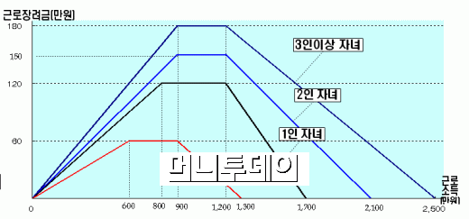 또 부양자녀가 1인일 경우 연간 총소득 기준은 1700만원, 최대 지급금액은 120만원으로 2인일 경우 각각 2100만원, 연 150만원, 3인 이상일 경우 2500만원, 연 180만원으로 설정됐다.
