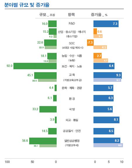 취득세 인하에 따른 지방재정 감소분 지원(2조1000억 원) 등 지방재정 지원과 새롭게 도입되는 재외선거 지원(608억 원) 등을 포함한 일반공공행정 내년 예산은 56조6000억 원으로 올해보다 4조2000억 원(8.2%) 늘어났다.