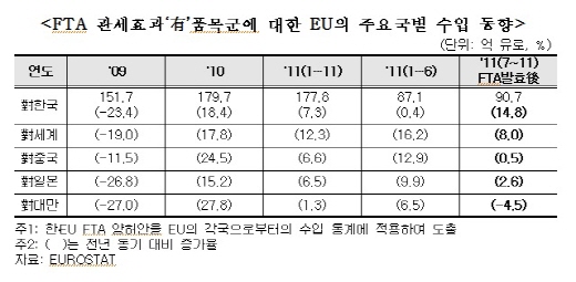 관세 즉시 철폐 품목군의 대EU 수출 증가율은 지난해 상반기에 전년 동기 대비 -1.3%로 감소했던 것이 FTA 발효 이후 5개월 간 8.1%의 증가세로 전환됐다. 3년 철폐 품목군의 수출 증가율도 지난해 상반기 전년 동기 대비 10.2%에서 FTA 발효 이후 27.0%로 2배 이상 증가했다. 5년 철폐 품목군의 경우 2010년과 지난해 상반기 연속해서 전년 대비 수출이 감소했으나 FTA 발효 이후에는 전년 동기 대비 103.6% 늘어나는 성과를 거뒀다.