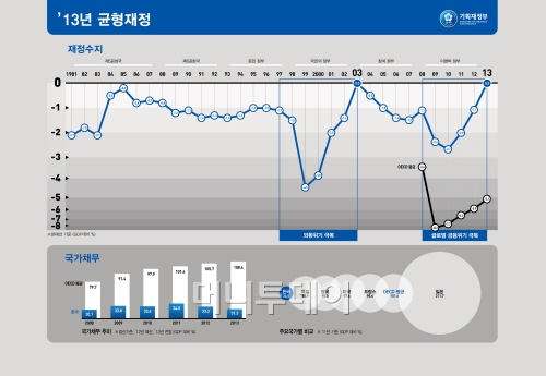 ◇정부 '균형재정' vs 정치권 '복지확대'= 김동연 기획재정부 차관은 2013년 예산안 편성지침을 설명하면서 '균형재정을 달성해야 하는 이유'에 상당한 공을 들였다. 1980년대 이후 재정수지 추이를 그래프로 만들어 배포하면서 1980년대 이후 균형재정을 달성한 것은 2003년 단 한차례밖에 없다고 강조하기도 했다.