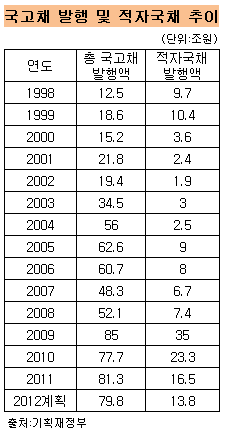 우리나라 적자국채 발행은 1998년으로 거슬러 올라간다. 정부는 외환위기 직후였던 1998년 9조7000억 원을 시작으로 매년 적자국채를 발행해 왔다. 적자국채 발행 규모는 글로벌 금융위기 직후인 2009년 35조원으로 사상 최대를 기록한 이후 감소해 올해는 총 13조8000억 규모의 적자국채를 발행하기로 했다.