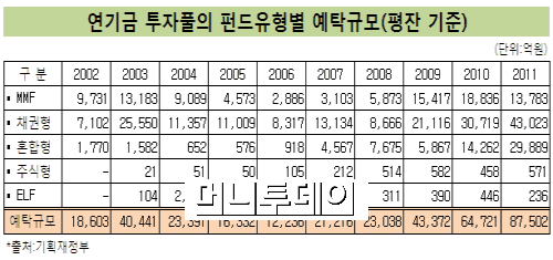 올해 2분기 기준으로 연기금 투자풀 총 예탁규모는 10조2442억원(평잔 기준)이다. 재정부가 연기금들이 투자풀에 자산을 예탁하도록 유도하면서 2002년 1조9000억원에서 매년 규모가 커지는 추세다. 투자풀에 자금을 예탁하는 연기금 숫자도 2002년 42개에서 지난해에는 56개로 증가했다.
