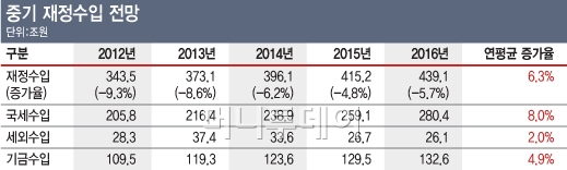 재정수입과 지출 증가율은 일제히 하향됐다. 정부는 2012~2016년 중기재정계획에서 재정수입이 연평균 6.3%, 지출이 4.6% 각각 증가할 것으로 전망했다. 이전 중기재정계획에 비해 재정수입 증가율은 0.9%포인트, 지출 증가율은 0.2%포인트 각각 후퇴했다.