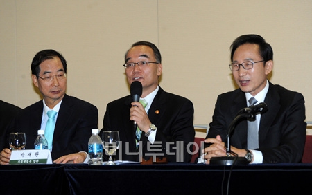 민관대표단이 언론의 스포트라이트를 받으며 기자회견장으로 들어섰고 별도의 주문이 없었는데도 자연스럽게 어깨동무를 했다. "될 가능성이 있지만 어려움이 있는 것도 사실"이라며 반신반의하던 대표단의 얼굴에 웃음꽃이 폈다. 이내 이 대통령도 모습을 드러냈다. 이 대통령은 "축하한다"며 송 시장의 어깨를 두드렸다.