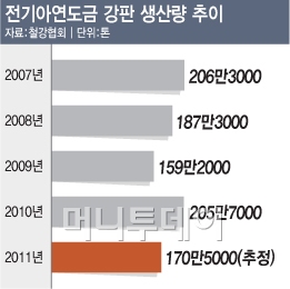 철강협회 통계에 따르면 2007년 206만3000톤이던 전기아연도금 강판 생산량은 이듬해 187만3000톤으로 격감했고 이어 2009년엔 159만2000톤까지 쪼그라들었다.