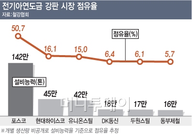 특히 상위 3개 업체 시장 점유율이 82%에 달하는 과점구조가 담합을 보다 쉽게 했다. 시장 점유율을 보면 업계 1위 포스코가 51%를 장악하고 있고 현대하이스코가 16%, 유니온스틸이 15%로 뒤를 잇고 있다.
