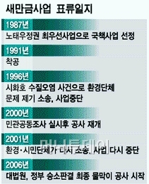식량 확보를 위해 오래전부터 추진됐던 새만금사업은 지난 1987년 노태우정권이 최우선사업으로 꼽으며 국책사업이 됐고 1991년 첫 삽을 떴다. 그러나 진행되는 과정에서 1996년 시화호 수질오염사건이 터지며 환경단체가 문제를 제기, 사업이 중단됐다.
