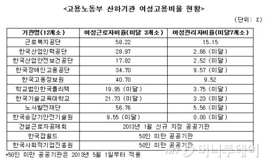 정부의 고용정책을 책임지고 있는 고용노동부의 산하기관들의 여성 고용률이 매우 저조한 것으로 조사됐다. 12개 산하기관의 여성 고용률은 우리나라 전체 사업장의 평균치보다 낮았다.