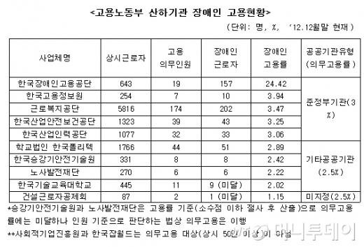 일부 산하기관은 장애인 의무고용률조차 지키지 않고 있는 것으로 나타나 고용부가 주무부처로서 관리에 소홀하다는 지적이 나오고 있다. 고용부는 '적극적 고용개선조치' 이행 강화를 주문했다.