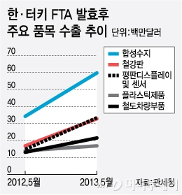 산업통상자원부와 관세청, 대한무역투자진흥공사(KOTRA)에 따르면 5월 대(對)터키 수출은 4억7599만달러로 지난해 같은 달보다 29.9% 늘었다. 수입이 지난해 5월 4642만달러에서 올해 5월 4652만달러로 별 변동이 없는 것과 비교하면 상당한 변화 폭이다.