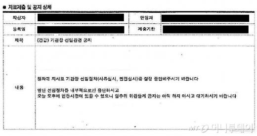 청와대는 지난 11일 전 부처에 현재 진행 중인 산하 공공기관장 인선 작업을 전면 재검토하라는 내용을 담은 지침을 하달한 것으로 16일 머니투데이 취재 결과 확인됐다. 각 부처는 청와대의 이같은 지침을 부처 업무연락망을 통해 산하 공공기관에 즉각 전달했다.