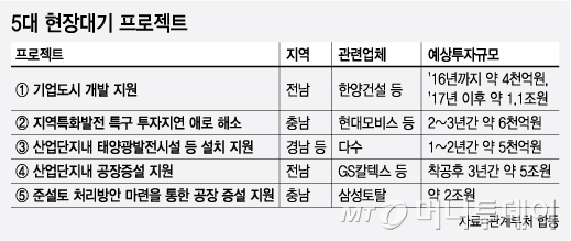 방안에 따르면 현장 대기 중인 프로젝트 5개를 발굴, 애로 사항을 해결했다. 투자 규모만 9조6000억원에 달한다. 우선 산업단지내 녹지를 공장용지로 사용할 수 있게 된다. 기존 공장 옆에 공장을 증설할 수 있도록 하기 위한 조치다. 3년간 약 3조원의 투자 효과가 있을 것으로 정부는 추산했다. 해안 인근 공장 증설 때 나오는 준설토를 외해에 버리는 방안도 추진된다. 바이오·관광특구에 자종차 연구시설을 지을 수 있도록 특구계획을 변경하는 내용도 담겼다.