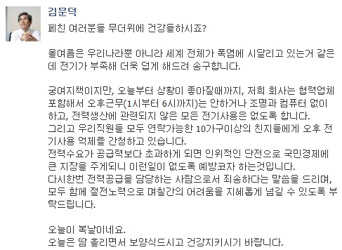 김문덕 한국서부발전 사장은 12일 오전 자신의 페이스북에 "우리직원들 모두 연락가능한 10가구이상의 친지들에게 오후 전기사용 억제를 간청하고 있다"며 "전력수요가 공급력보다 초과하게 되면 인위적인 단전으로 국민경제에 큰 지장을 주게되니 이런일이 없도록 예방코자 하는것"이라고 글을 올렸다.