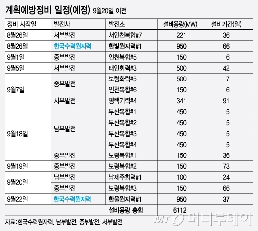중부발전도 보령화력(50만kW), 보령복합(45만kW), 인천복합(30만kW) 소속의 발전 설비들을 멈출 계획이다. 동서발전은 9월말 총 125만kW 규모의 발전소들에서 계획예방정비를 시작할 예정이다.