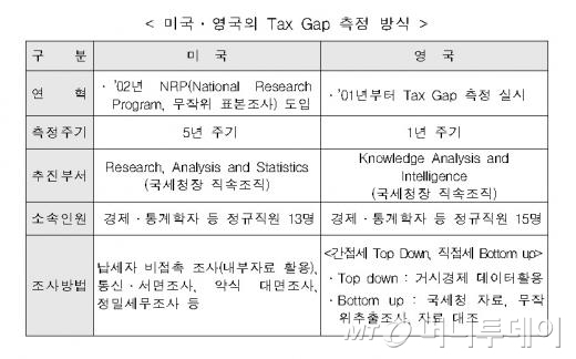 실제로 미국은 5년 주기로 국세청장 직속 조직을 통해 '택스 갭'을 측정, 국세행정에 활용 중이며 영국도 1년 주기로 '택스 갭' 파악을 진행하고 있다.